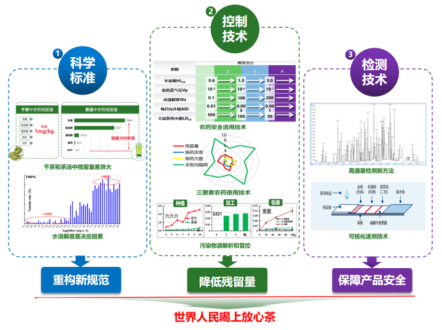 針對國際茶葉最大殘留限量(MRLs)不合理,殘留量階段性發生嚴重,檢測方法靈敏度低等問題,首次提出茶湯“有效風險量”決定原則,重構了茶葉中MRLs制定的國際規范;研發了茶園農藥安全選用、合理使用和污染物源控制的殘留控制技術;突破現場快速檢測和高通量精準檢測難點,研發出490種化學品檢測技術,吡蟲啉、啶蟲脒等速技術和產品;研制出54項國內外標準,構建了“MRLs制定、殘留控制、識別檢測” 為核心技術的管控體系,顯著提高了我國茶葉質量安全水平。該成果獲2019年度國家科學技術進步二等獎。