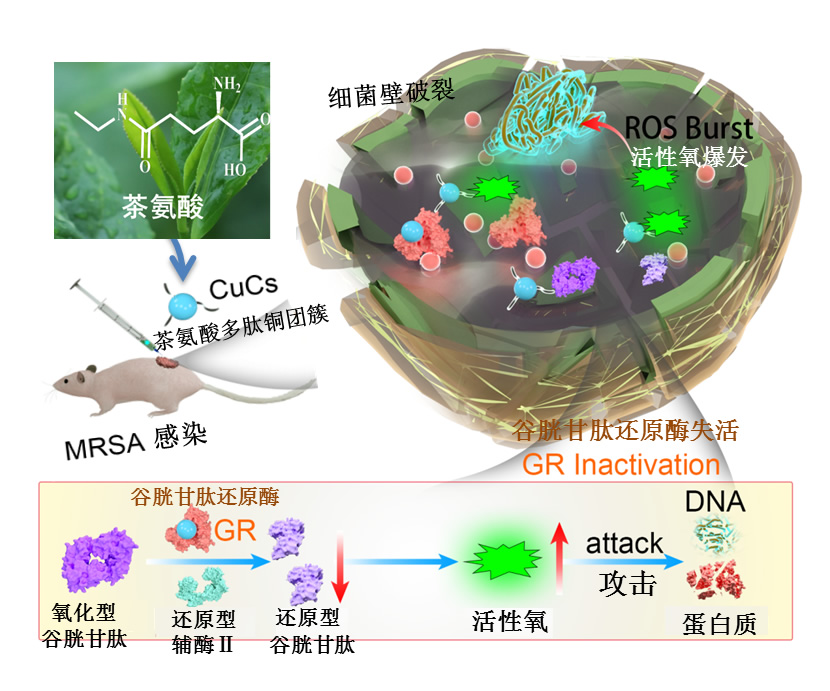 “團隊利用茶樹中天然活性分子茶氨酸為結構單元,設計功能多肽構建了具有精確分子組成的茶氨酸多肽銅團簇,能夠高效地殺傷耐甲氧西林金黃色葡萄球菌,對因此引起的小鼠皮膚感染和敗血癥感染有良好的治療作用,其治療效果與臨床用藥莫匹羅星和萬古霉素相當。”論文通訊作者魯成銀研究員說。